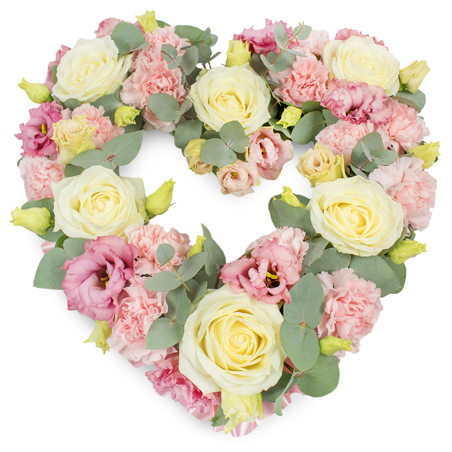 Show your heartfelt appreciation with this unique and captivating flower bouquet. It features a stunning combination of white roses, pink carnations, pink lisianthus, and fragrant eucalyptus, artfully arranged to form an open heart.